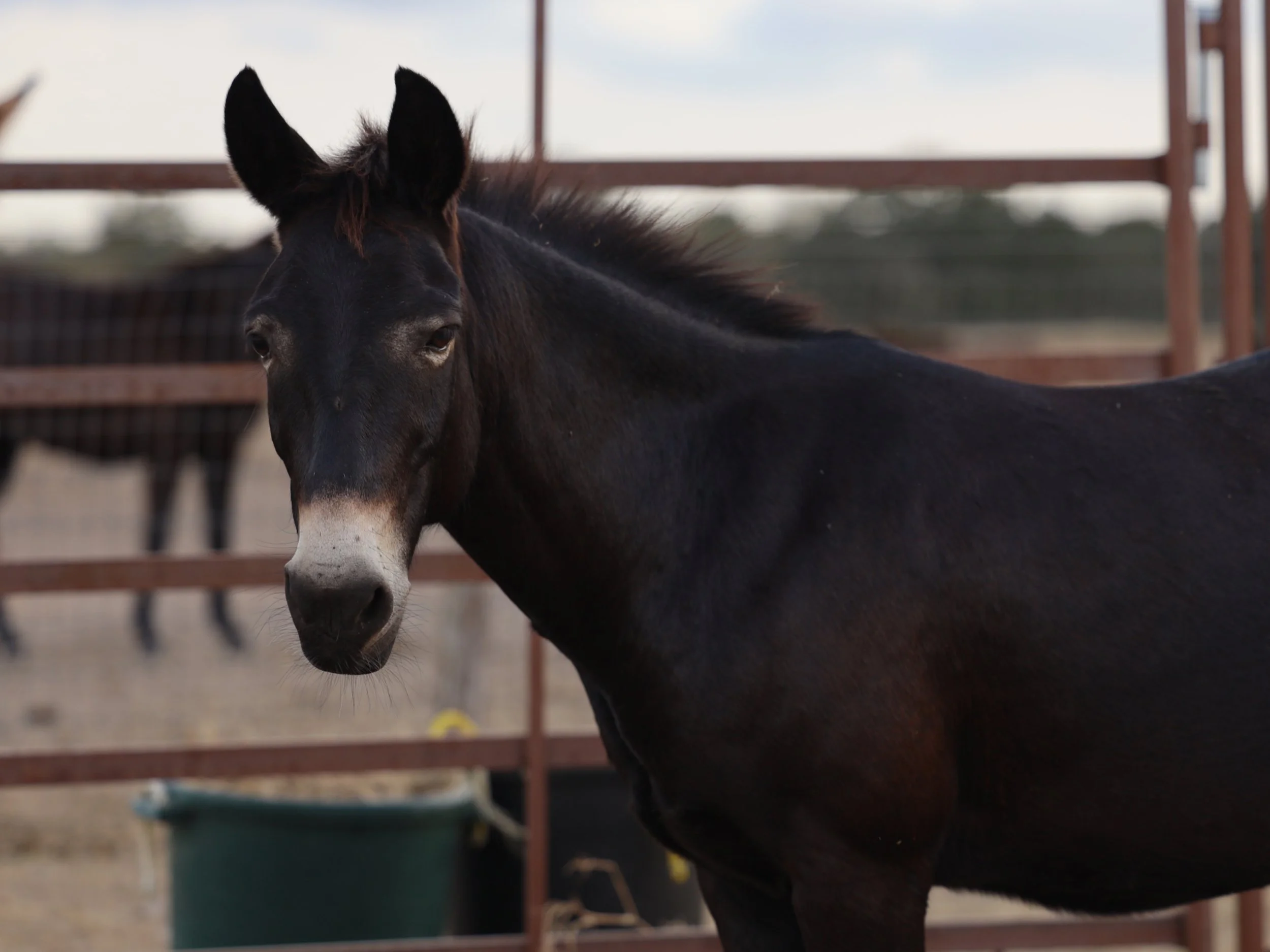 Surrendered in 2024, Raisin is an 11 year old John mule who came to Lost Meadows after his previous owner entered a health battle. He is currently at our training program in Liberty Hill to hopefully become adoptable. Stay tuned!